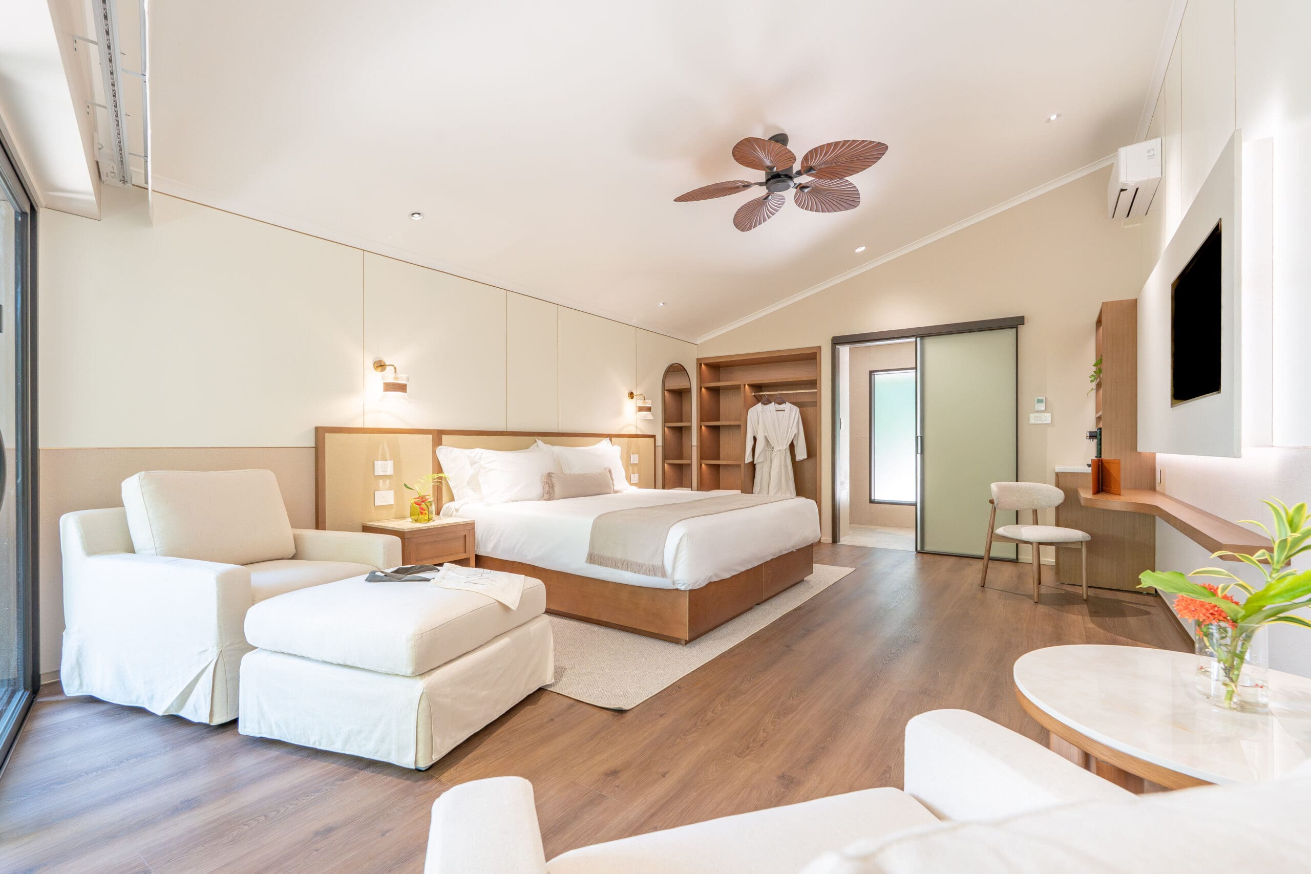 Contemporary and calming, The Studio Room is designed for flexibility and effortless comfort. This open-plan studio features a king size mattress (configurable as Twin Beds), and custom-made linen to ensure your best night’s sleep. The cool and relaxing space is styled with lounge chairs and ottomans, creating a cosy nook for relaxing, sipping wine, or simply recharging.